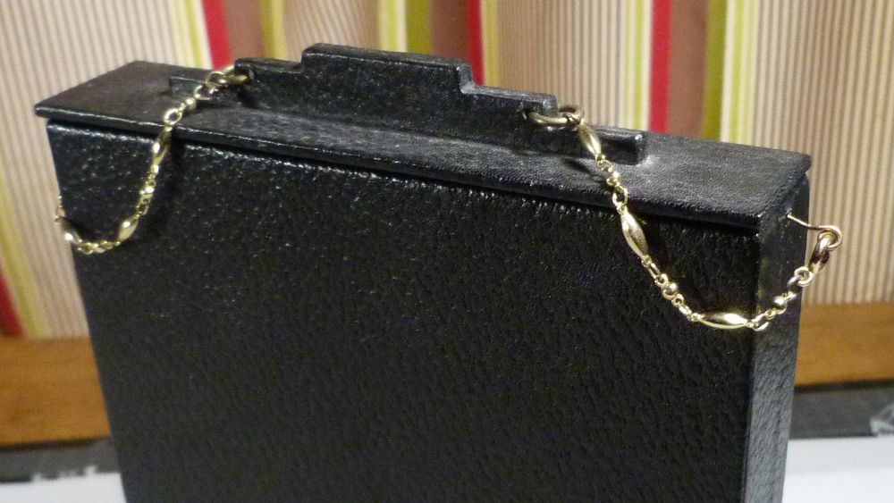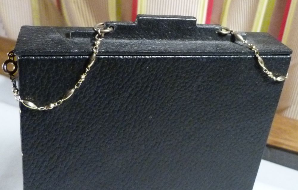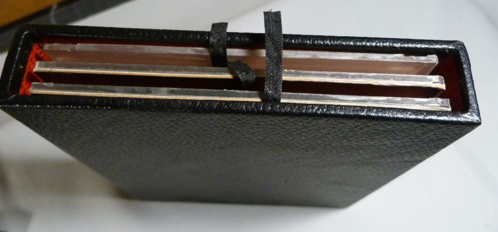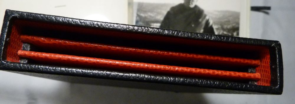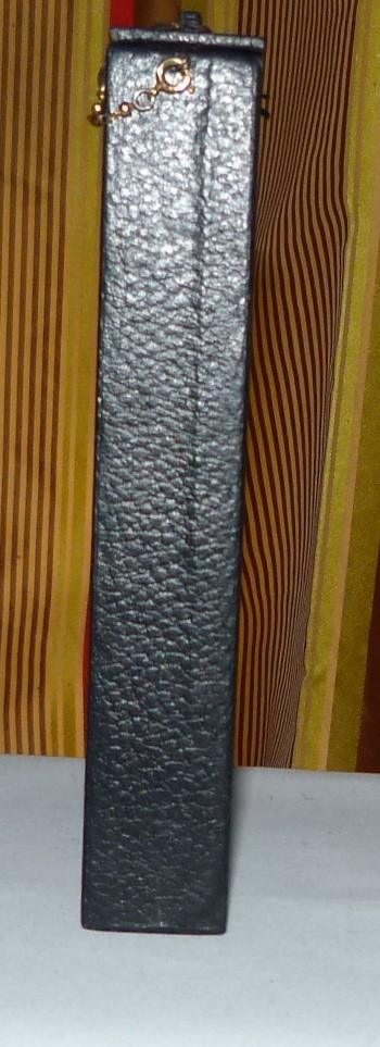Extérieurement on a affaire à un parallélépipède rectangle de 13.5cm x 16.5cm x 2.8cm, en cuir noir de vache. Il est titré sur une face.