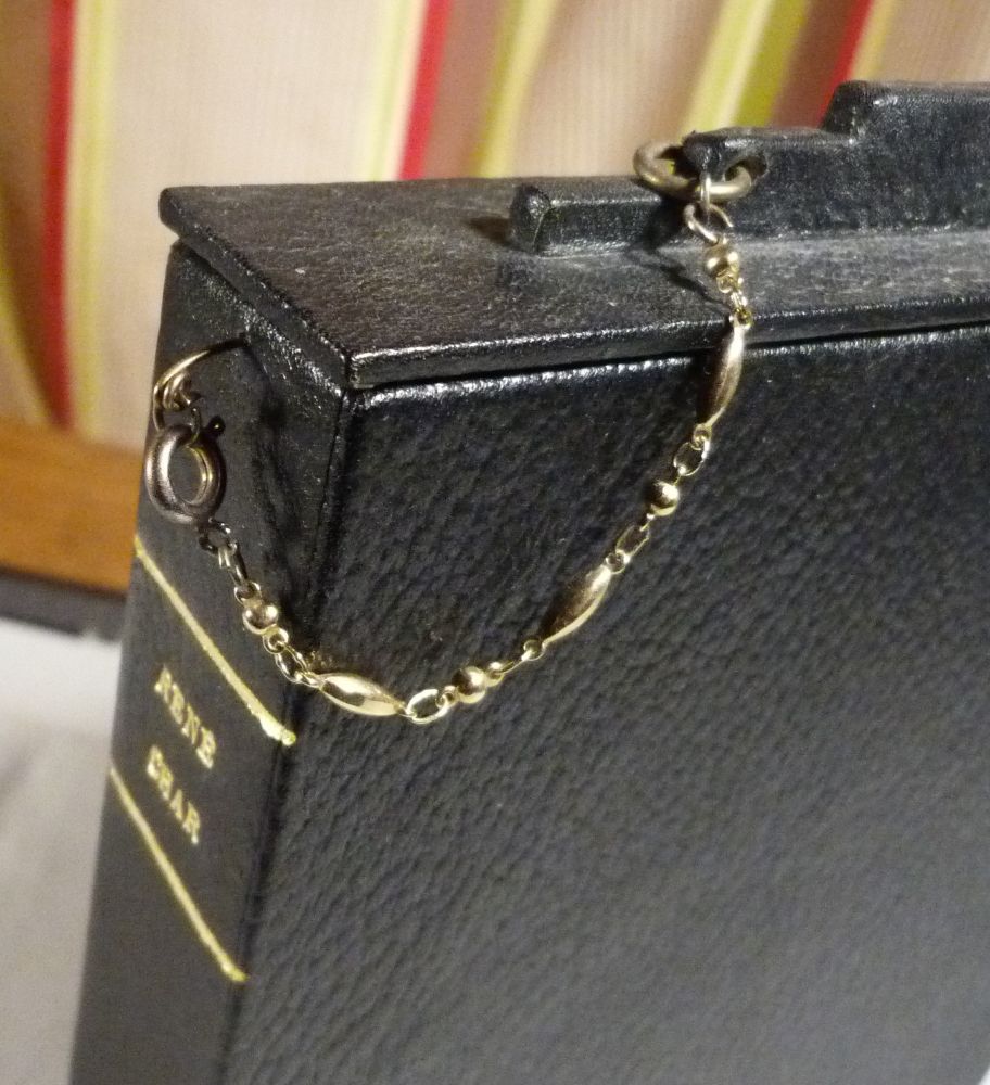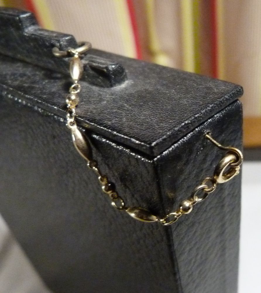 Cet étui est surmonté d’une coiffe d’où partent 2 petites chaines en or dont les extrémités s’insèrent dans l’étui pour bloquer la coiffe.
