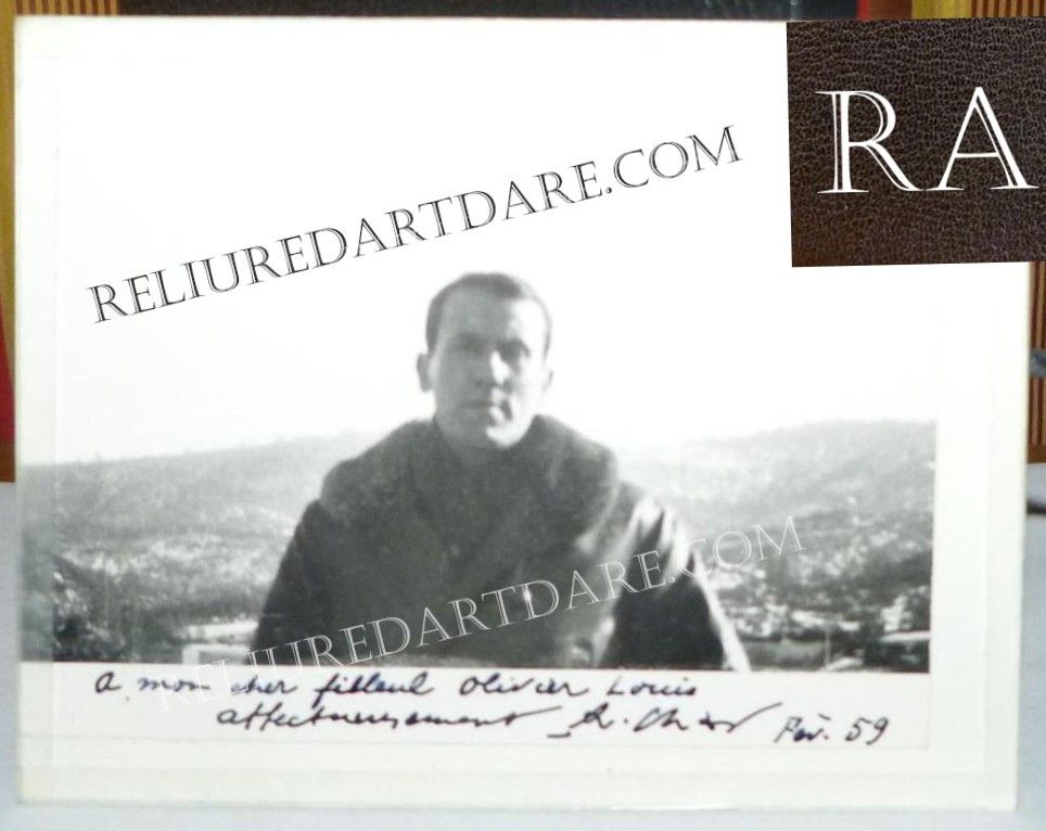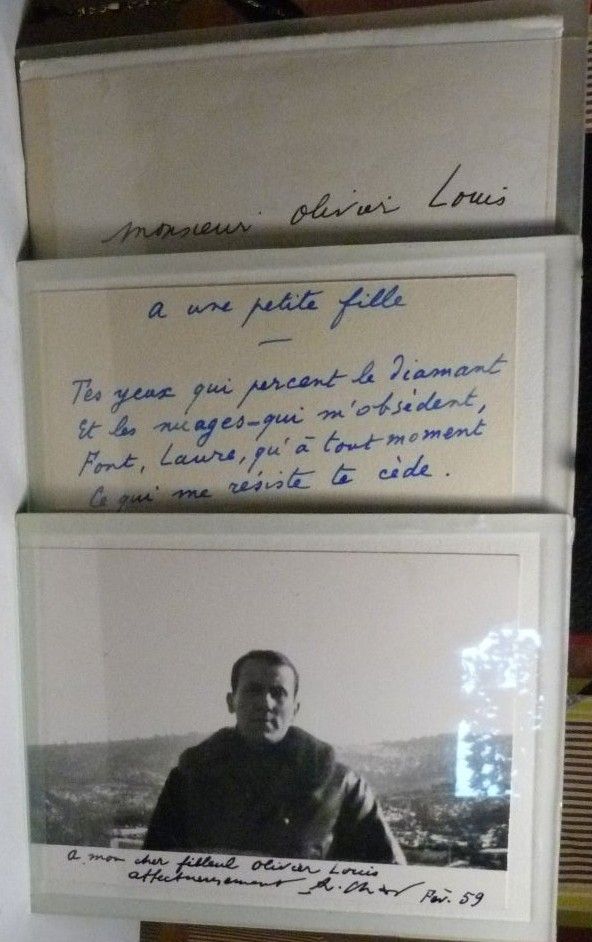 Au premier trimestre de 1958, jetais en 7ième (CM2) à l’école primaire du Bvd de la Saussaye à Neuilly/Seine. Notre instituteur avait créé un journal de l’école alimenté par les écoliers. Mon père me fit écrire à René Char (mon parrain) pour lui demander un texte à publier. Ce qu’il fit sous forme d’un quatrain. Il n’a pas été publié dans le journal de l’école, ni ailleurs.