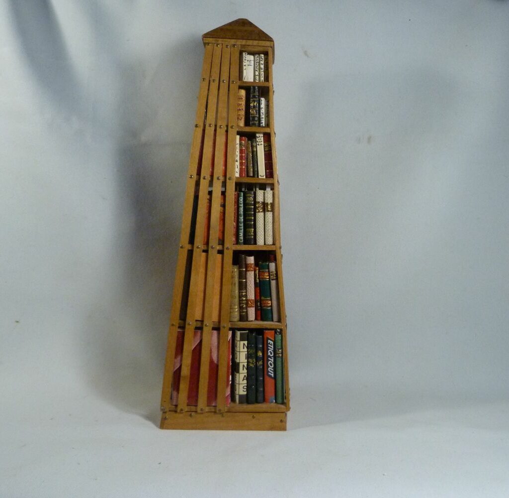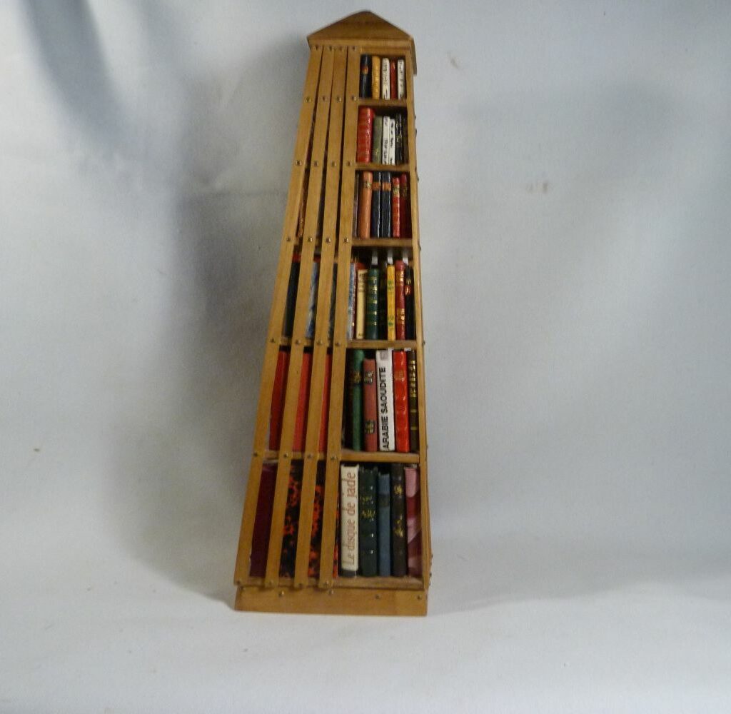 Cette mini-bibliothèque en bois contient 131 mini-livres sur 6 niveaux.
